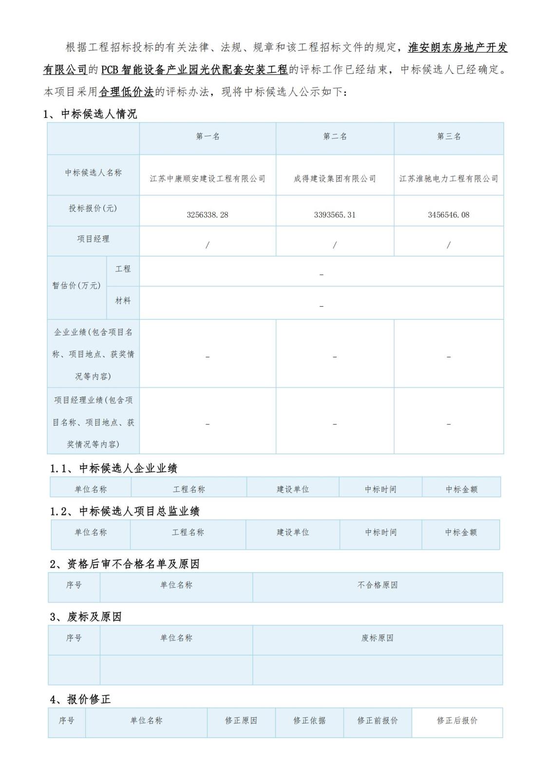 淮安朗東房地產(chǎn)開(kāi)發(fā)有限公司PCB智能設(shè)備產(chǎn)業(yè)園光伏配套安裝工程評(píng)標(biāo)結(jié)果公示