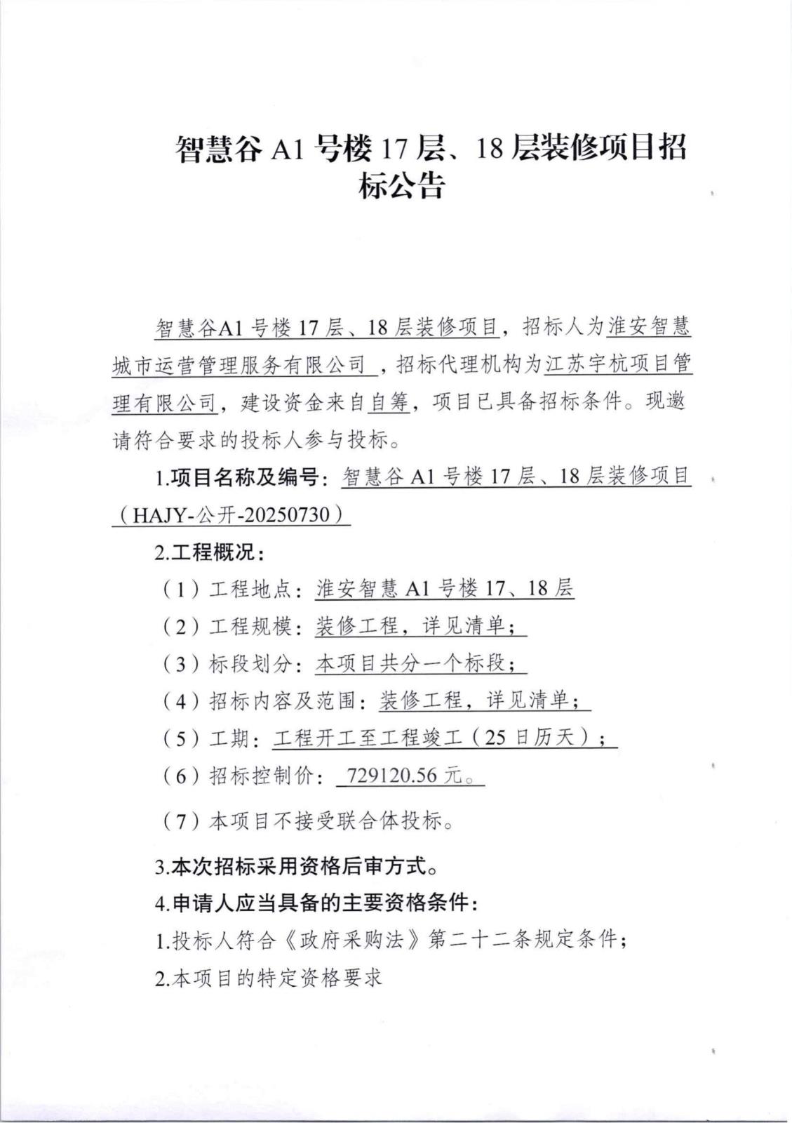 智慧谷A1號(hào)樓17層、18層樓裝修項(xiàng)目招標(biāo)公告